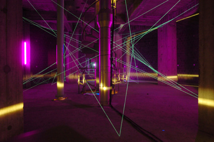 vuegen christine KOEN DE DECKER Een luchtig netwerk van diagonale fluores~ cerende draden, kubussen op rolwioltjos die strak geometrische lichtstrepen uitstralen en een gekanteld vierkantje uitgesn~den in een van de verduisterde ramen, Een onooglijk detail dat van de ruimte een ca- mera obscura maakt, uitkijkenci op kaduke dakpannen. Voeg daar paarse en groene fluorescentlolampen aan toe en je krijgt een psychedelische feeèrie. Zo transformeerde Koen De Decker vorige zomer de Water-to- ren in Bredene, tegenwoordig een filiaal van het S.M.A.K.. Dat hij zo sterk kon toeslaan, hadden we niet van hem verwacht. Tot dan vielen we niet direct in zwijm voor zijn re- alisaties, hoewel er prikkelende elementen opdoken. De kubus bijvoorbeeld, waar je een draai aan kan geven zodat de rond- Wervelende lichtlijnen een Vertigo-effect teweegbrengen. 'Ik ben altijd op zoek naar een ultiem den- ken', zegt de kunstenaar, In één van zijn schetsboeken heeft hij het opgetekend- `Het ultieme denken is zonder formuleerbare gedachte (misschien enkel suspense of vibratie of frequentie).' Daar kwam hij in Bredene heel dicht bij. De diagonale draden leken laserstralen, maar je kon er wel dege- lijk over struikelen, Even kwam het paviljoen van Tobias Rehberger in gedachten, een skeletstructuesr van lichtgevende latten, Maar de jonge Vlaamse kunstenaar doet niet aan architectuur. Hij verwijst zelfs niet naar de werkelijkheid, hoewel hij daar toch hij terecht kan komen. Zelf spreekt hij van `anti-ruimtes, die niet aar de realiteit zijn gerelateerd maar realiteit worden. Het gaat altïjd om een naar zichzelf of naar mijzelf verwijzend systeem. Het is een reflectie van binnenuit, een soort feedback.' Koen De Decker Zit duidelijk in de lift. Later dit jaar laat Kunsthalle Lophem hem los en Crown Gallery in Brussel pikt hem op voor de eerste galerietentoonstellir',g, Bijzonder verkoopbaar is zijn productie niet. Met een bolletje touw of een pakket bamboestokken bouwt hi~ installaties, een figuur van kippen draad houdt zich op rubberlaarzen staande met een slok in elke hand en de tekeningen zijn niet meer dan afgescheurde ideeën. Hij verkent zijn verbeelding, de wereld, ab- stracte patr000n, zet zijn privé-verzameling van uiteenlopende objecten in als `geheuge- nar-chief', filmt `homevideo's' waarin we zijn oog zien dat zijn eigen oog weerspiegelt. In zijn Rijksakademietijd ging hij aan de slag met gele elektriciteitsbuizen, de buizen waar Honoré d'O een patent op lijkt te hebben. Daarom week hij uit naar rode geribbelde buizen, kabelbeschermers, en weeft er door- kijksculpturen mee. 'De eerste strategische stap van de meeste kunstenaars is herken- baar worden', zegt hij. 'Ik probeer zoveel mogelijk vluchtwegen te creëren.' Christine Vuegen KUNSTBEELD nr02 2005 Koen De Decker, van 19 februari t/m26 maart, Crown Gallery, Hopstraat 7, Brussel,dot/m zat 14.30-18.30 uur, www.crowngallery.be